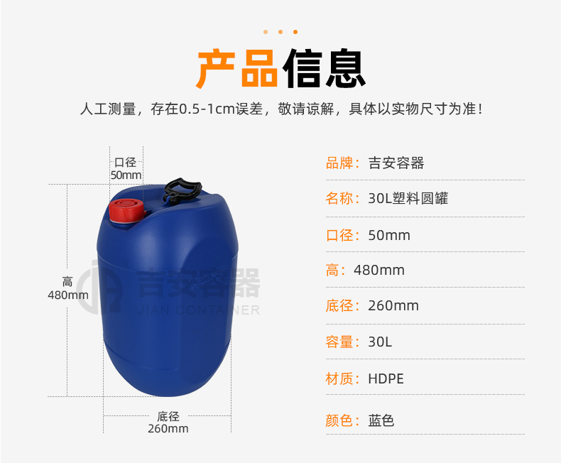 小口塑料桶:采用全新聚乙烯原料吹塑工藝制作而成,具有耐腐蝕,耐酸堿特性,小口設計密封性能強,廣泛應用于化工、清潔、食品、添加劑、汽車等各行業(yè)液體包裝。