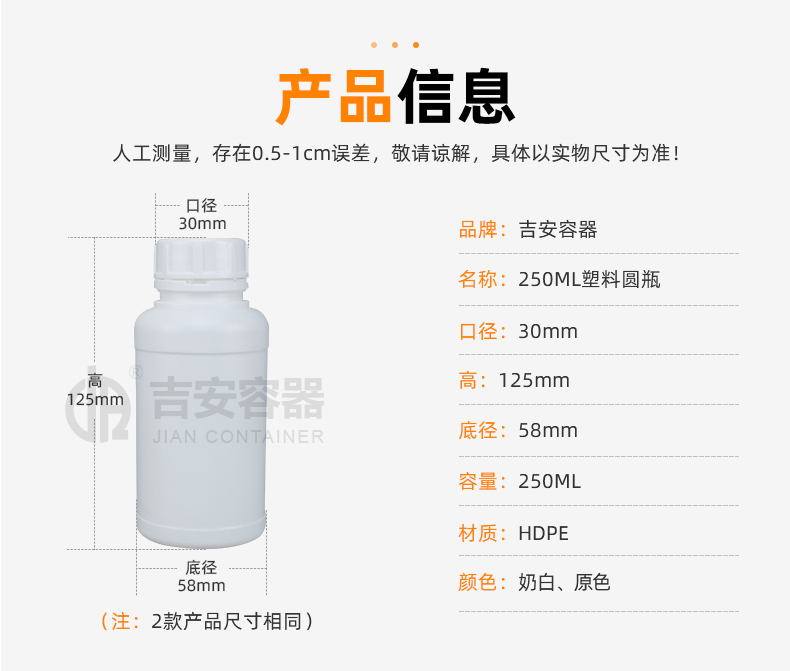 小口塑料瓶采用全新HDPE塑膠原料吹塑而成,具備韌性好、耐酸堿、耐腐蝕、不變形,密封性能佳等特點,可根據(jù)客戶需求定制、改色、產(chǎn)品適用于化工、清洗劑、醫(yī)藥、液體、食品、農(nóng)業(yè)等各行業(yè)包裝。